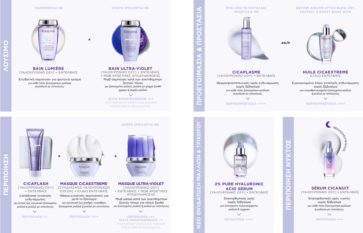 Με την Blond Absolu, η Kérastase προσφέρει ενυδάτωση, επανόρθωση, αποδυνάμωση των ζεστών τόνων και προστασία για κάθε τύπο ξανθών μαλλιών. Επειδή κάθε ξανθό είναι μοναδικό, και επειδή υπάρχουν πολλοί τύποι μαλλιών, πολλές τεχνικές ξανοίγματος και πολλές αποχρώσεις ξανθού, κάθε γυναίκα με τη βοήθεια της Kérastase και του κομμωτή της μπορεί να φτιάξει τη δική της ρουτίνα περιποίησης ανάλογα με τις ανάγκες της.
